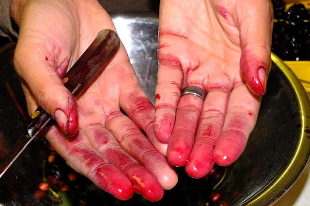 You can use a chopstick to push out the seeds. But now I have a pitter. Unfortunately, the cherries all have vinegar fly maggots, so the pitter is un-used.